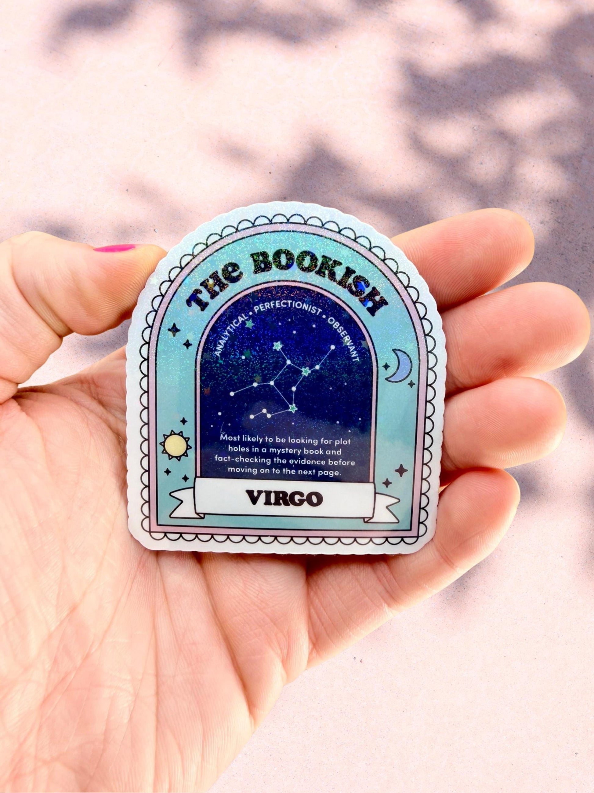 This Bookish Virgo sticker features celestial detail with a glittering holographic overlay — polished and perfect, just like you.